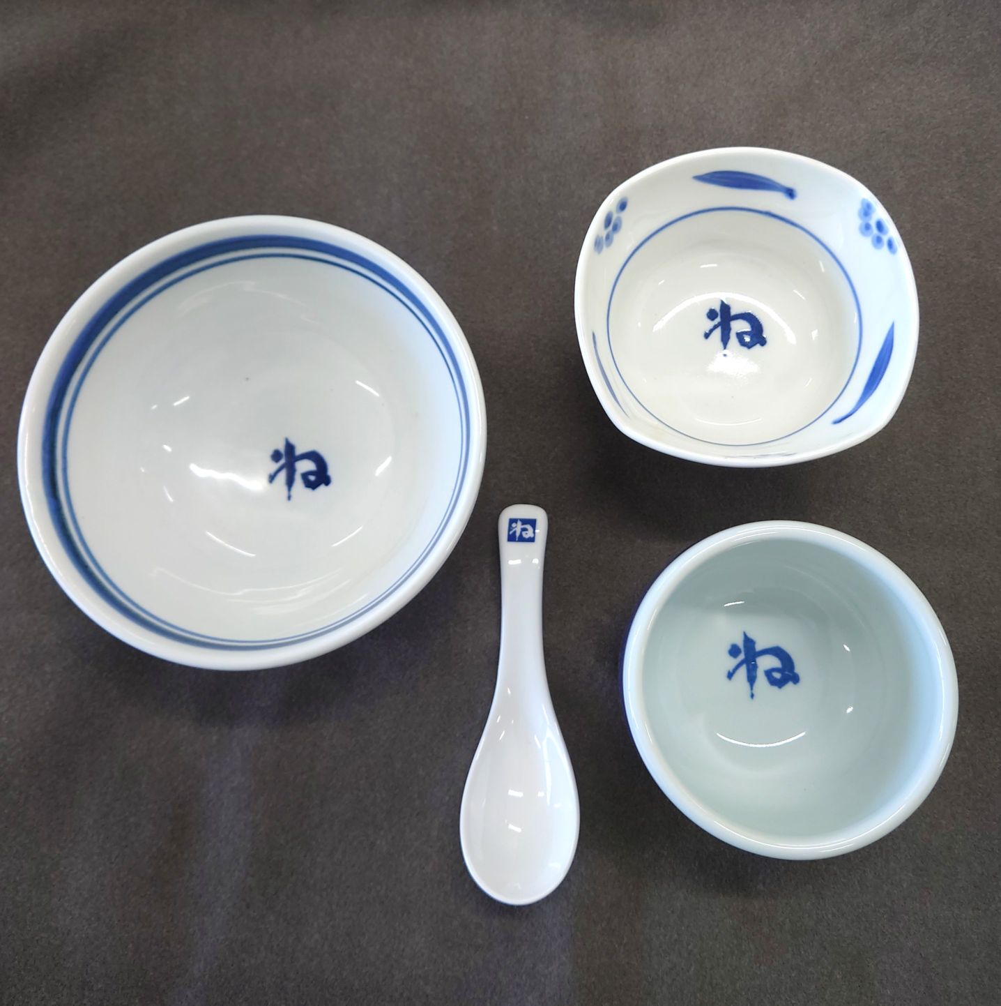 ごはん茶碗・とろろ椀・呉須巻スープ椀・レンゲはのロゴ入り。